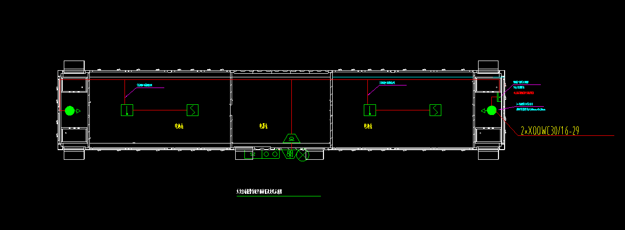此次集裝箱有一套 45 尺規(guī)格,通過客戶提供的圖紙,振興消防工程師連夜著急工程師進行開會討論,由負責的工程師連夜趕制出方案發(fā)給客戶,又和客戶的交流溝通中修改了N 次,最終確認了方案達成合作。根據《氣體滅火系統(tǒng)設計規(guī)范》GB50370、《氣體滅火系統(tǒng)施工及驗收規(guī)范》GB50263、《火災自動報警系統(tǒng)設計規(guī)范》GB50116 中的要求,這套儲能集裝箱消防系統(tǒng)由七氟丙烷滅火裝置、藥劑釋放管路和火災探測報警三大部分組成,根據集裝箱規(guī)格,設計采用 兩個30L 七氟丙烷滅火裝置,充裝 58KG 滅火藥劑,配置 2個感溫探測器和2 個感煙探測器與火災報警主機等形成一套完整的滅火系統(tǒng)。同時和業(yè)主的結構工程師一起交流確定儲能集裝箱外部報警設備能夠正常按照他們的箱體進行設計保護;內部管道固定方式;滅火裝置如何固定在運輸中才會更牢靠以及如何實現(xiàn)發(fā)生火災報警信號傳達給業(yè)主等細節(jié)。CAD 平面圖如下: